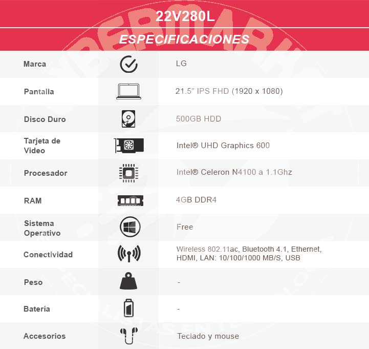 Este all in one de LG es un equipo diseñado para satisfacer las necesidades informáticas más sencillas y básicas del día a día, ya que está dotado de un procesador Intel N2910 de cuatro núcleos a 1,6 GHz, acompañado también de 4 GB de memoria RAM y un disco duro tradicional de 500 GB. En cuanto a la gráfica viene con la Intel HD Graphics integrada en el procesador.