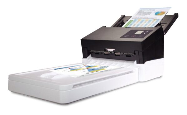 Gracias a la avanzada tecnología de procesamiento de imágenes y recorrido recto del papel, se pueden escanear lotes mixtos de documentos con tamaños y pesos variados, recortarlos adecuadamente, enderezarlos y dejarlos listos para usar. El tamaño de escaneado acepta papel de recibos 50 x50mm(2×2 en.) al documento comercial 242 x356mm(9,5x14en.). El alimentador automático de documentos también es lo suficientemente robusto como para cargar papel hasta413 gramos/m (110 libras) y tarjetas duras grabadas como tarjetas de identificación, tarjetas de crédito, licencia de conducir y tarjeta de seguro médico hasta1,25 mmgrueso.