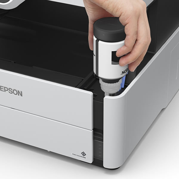 La multifuncional inalámbrica monocromática EcoTank® M2170 es la elección ideal para oficinas que necesitan alta productividad de impresión en blanco y negro a un costo ultrabajo sin sacrificar calidad. Con los tanques de tinta rellenables de superalta capacidad, podrá imprimir hasta 11.000 páginas en negro con dos botellas incluidas y hasta 6.000 páginas en negro con botellas de reemplazo.